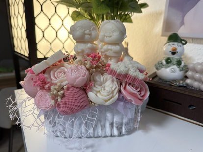 Jede einzelne Blüte wurde von Hand aus Rapswachs gegossen und liebevoll zu einem harmonischen Arrangement zusammengestellt. Verpackt in einer handgegossenen Form und ergänzt mit feinem Schleierkraut, ist dieser Strauß ein ganz besonderer Blickfang – ganz ohne zu welken.