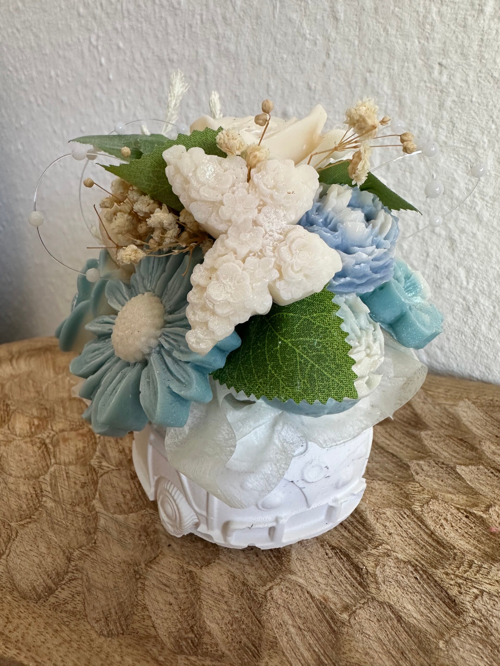 Jeder Strauß wird mit handgegossenen Kerzenblüten gefertig und in einem selbst hergestellten Gieß - Topf arrangiert.