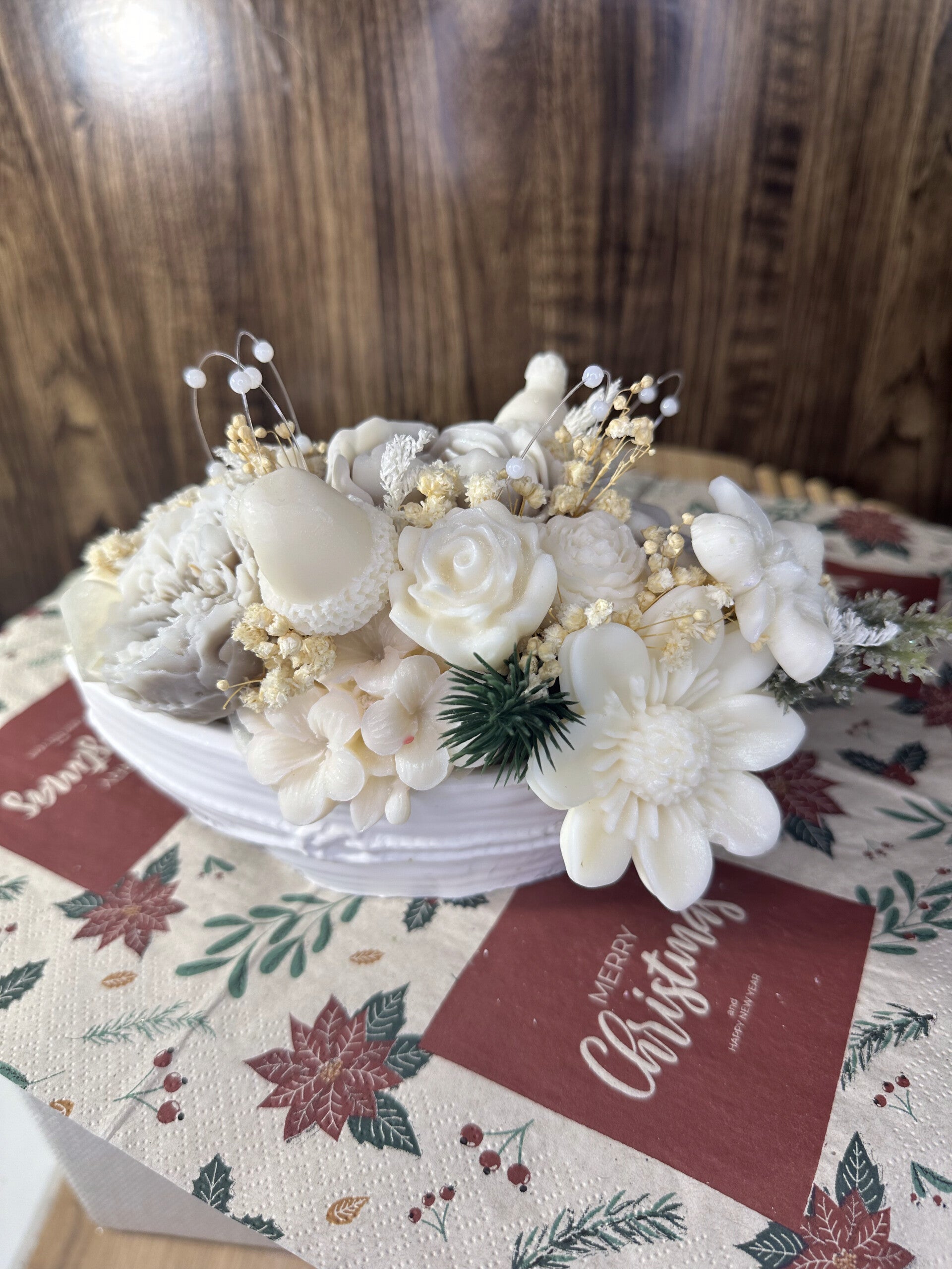 Jeder Strauß wird mit handgegossenen Kerzenblüten gefertig und in einem selbst hergestellten Gieß - Topf arrangiert.