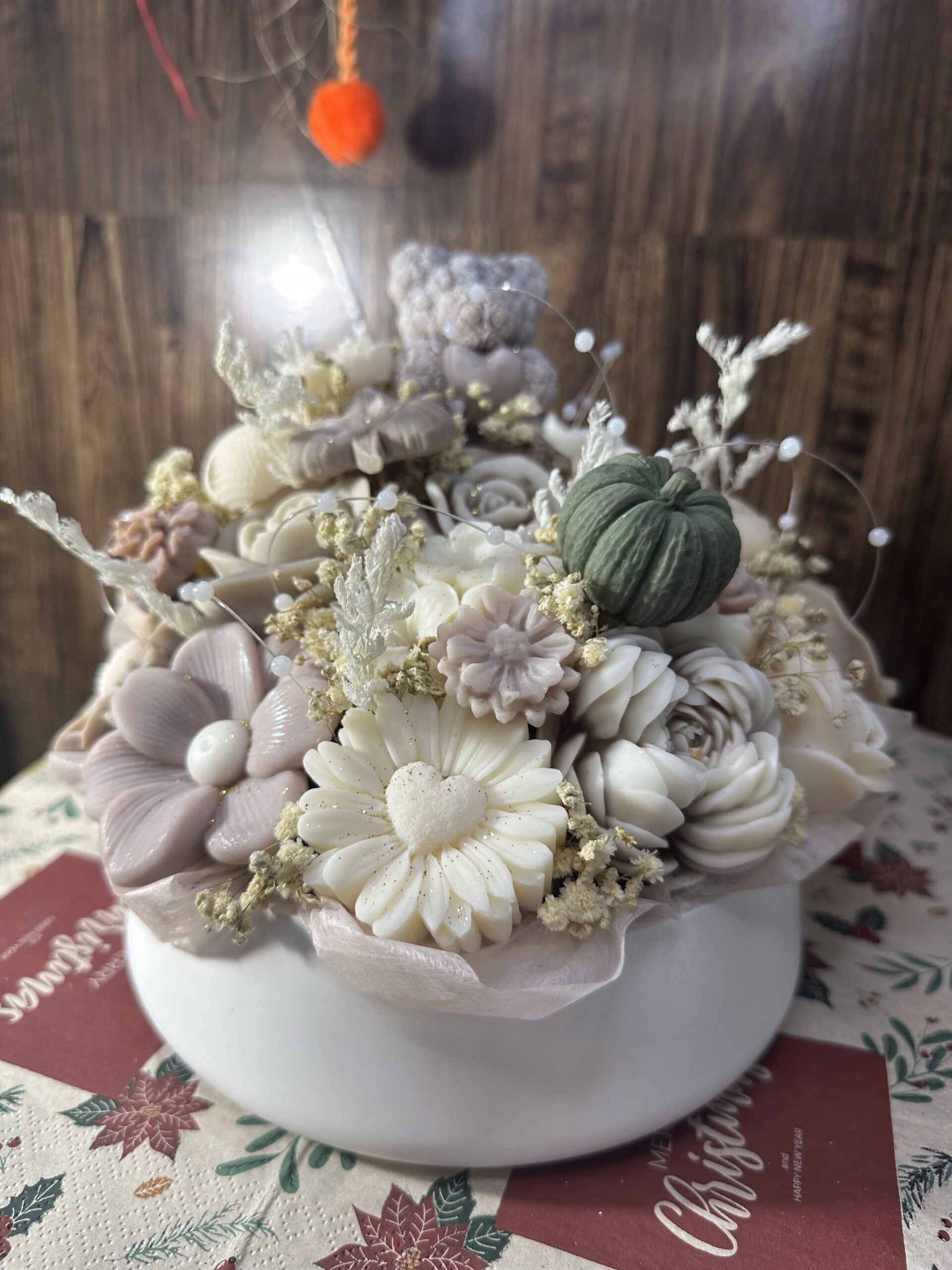 Jeder Strauß wird mit handgegossenen Kerzenblüten gefertig und in einem selbst hergestellten Gieß - Topf arrangiert.