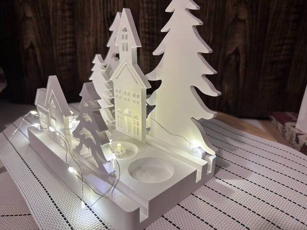 Der detailreich gearbeitete Teelichthalter aus hochwertigem Material zeigt kleine Häuschen und Tannenbäume in elegantem Weiß – perfekt für eine stilvolle, moderne Weihnachtsdekoration.