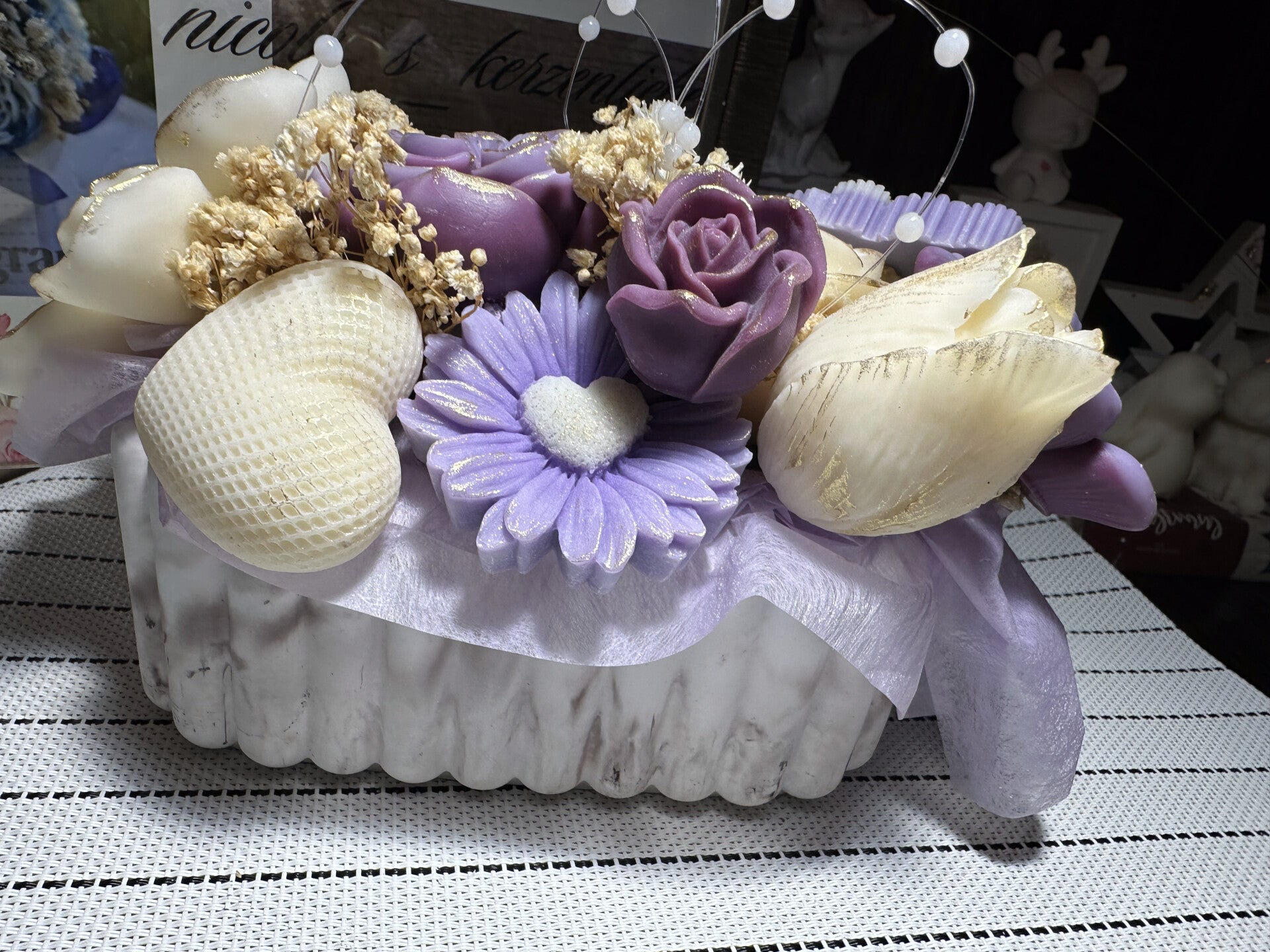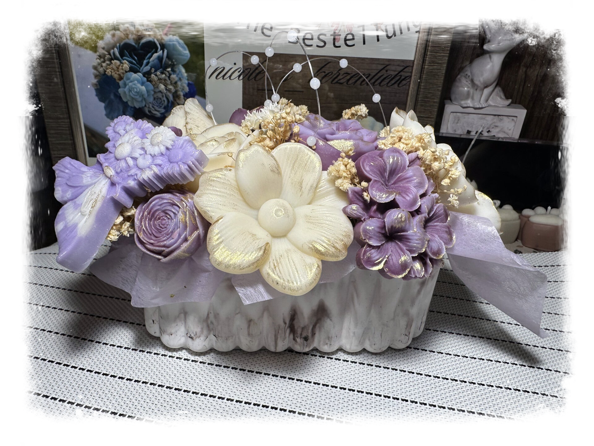 Tauche ein in die Welt von Bloom byNicole – ein Kerzenstrauß, der blumiger nicht sein könnte. Jede einzelne Blüte wurde von Hand aus Rapswachs gegossen und liebevoll zu einem harmonischen Arrangement zusammengestellt. Verpackt in einer handgegossenen form und ergänzt mit feinem Schleierkraut, ist dieser Strauß ein ganz besonderer Blickfang – ganz ohne zu welken.