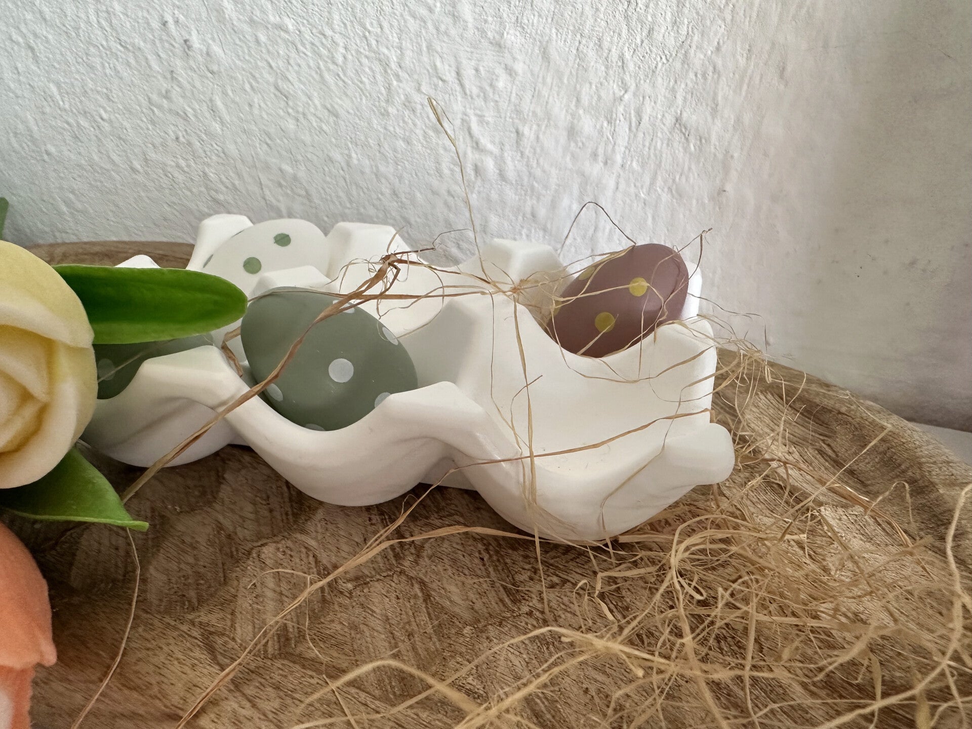 Die Schale dient als deko :-) Mit ihrer geschwungenen form und der matten Oberfläche passt sie perfekt zu cleanen, Interiors – und setzt dennoch einen verspielten, natürlichen Akzent.