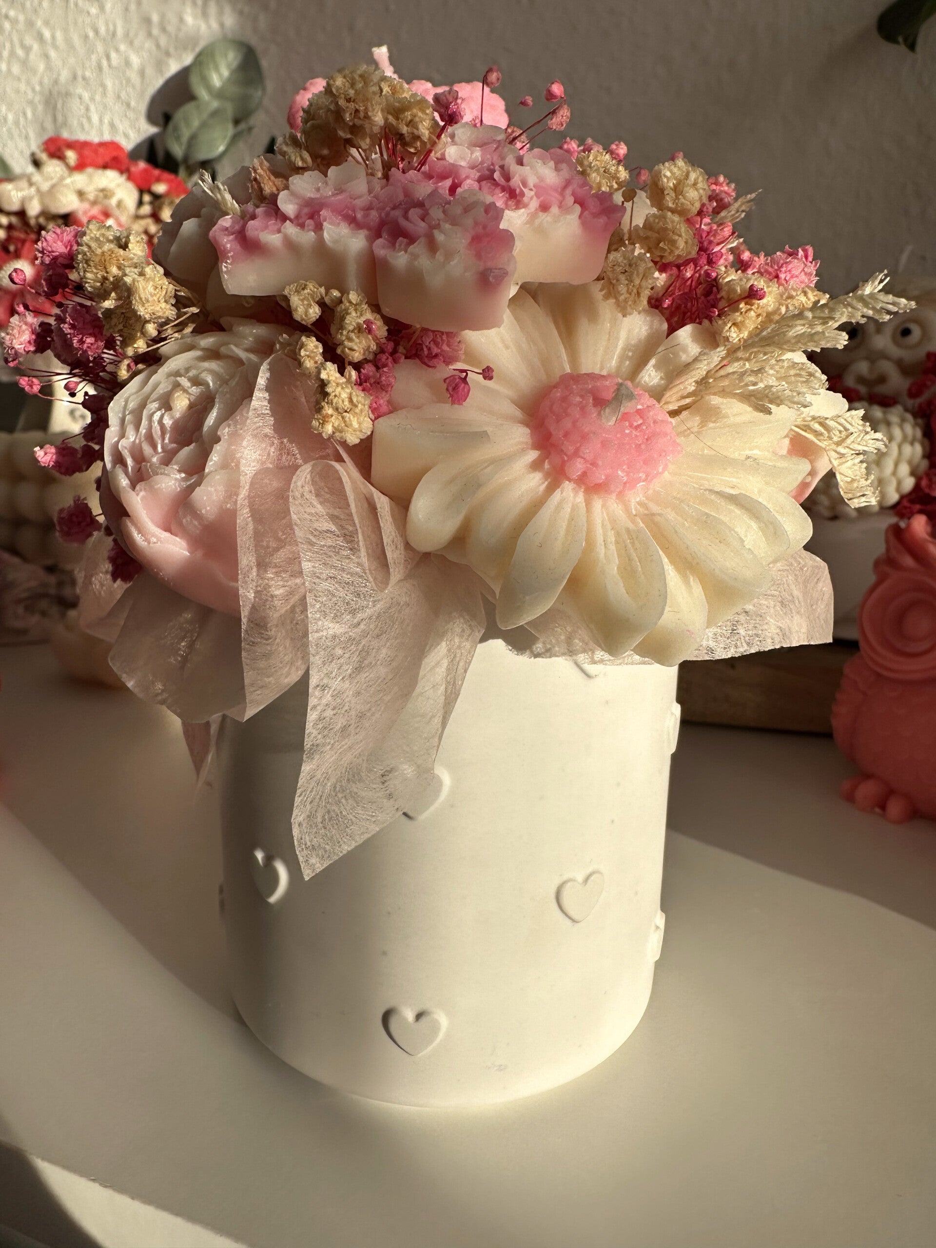 Tauche ein in die Welt von by Nicole – Raysin Edition. Jeder Strauß wird mit handgegossenen Kerzenblüten gefertigt und in einem selbst hergestellten Raysin-Topf arrangiert. So entsteht ein Arrangement, das nicht nur durch seine Blüten, sondern auch durch sein Gefäß zu einem echten Einzelstück wird. Verfeinert mit zarten Trockenblumen und abgestimmtem Seidenpapier ist dein Strauß ein besonderer Blickfang – ganz ohne zu welken.