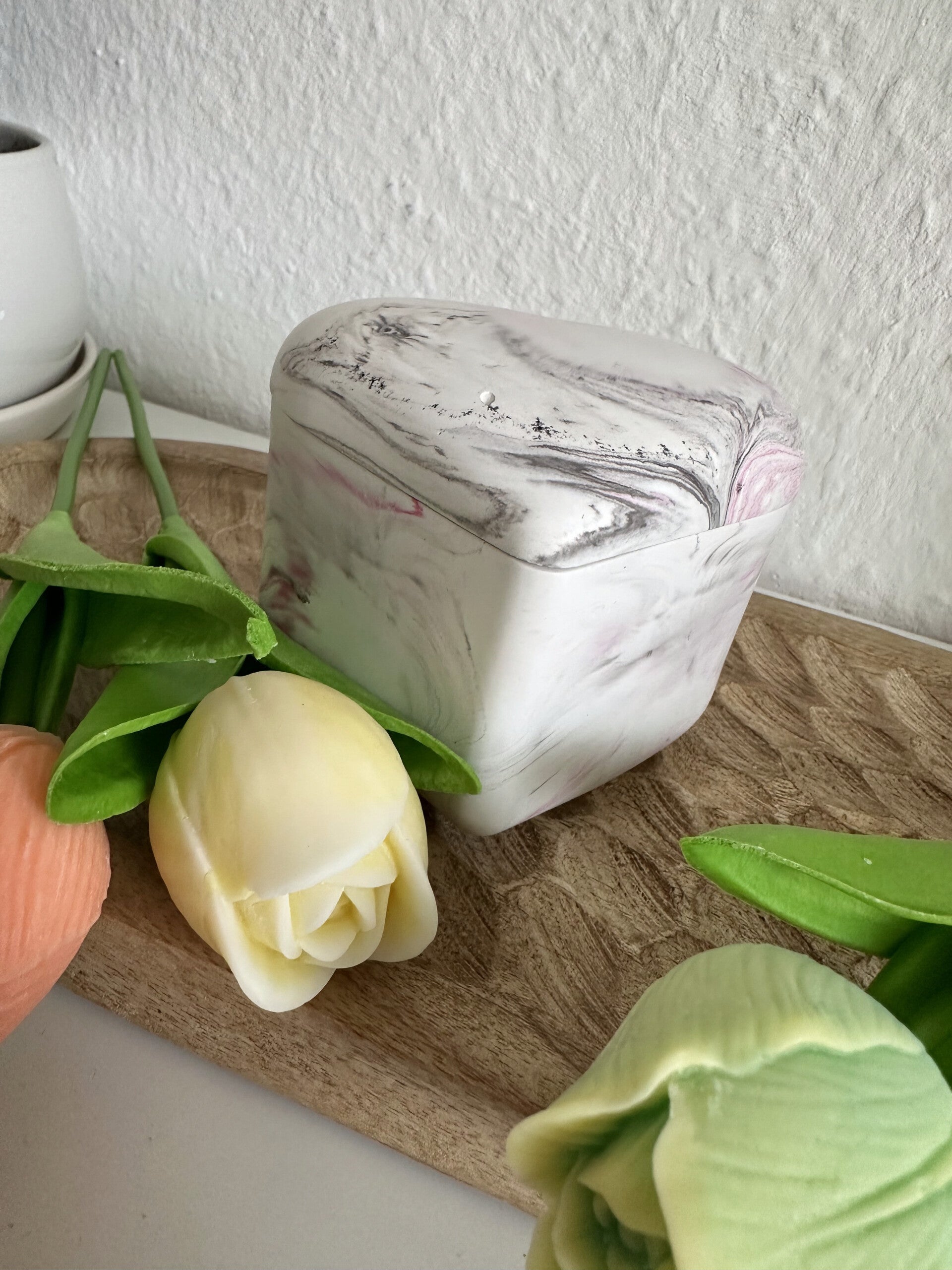 Jede Schatulle wird von Hand gegossen und ist somit ein Unikat. Kleine Unebenheiten und Luftbläschen sind charakteristisch für das Material und unterstreichen den individuellen Charme jedes Stücks.