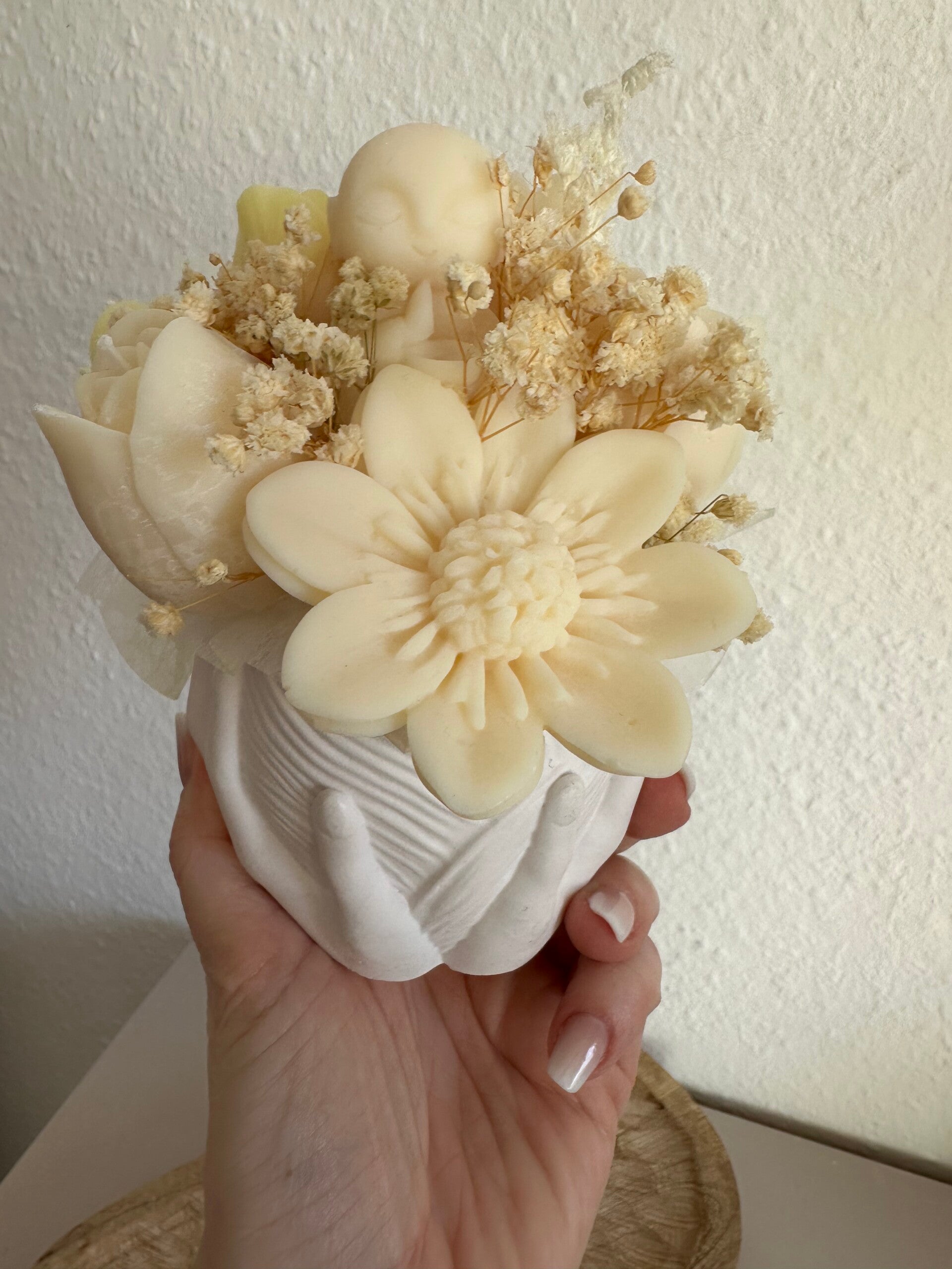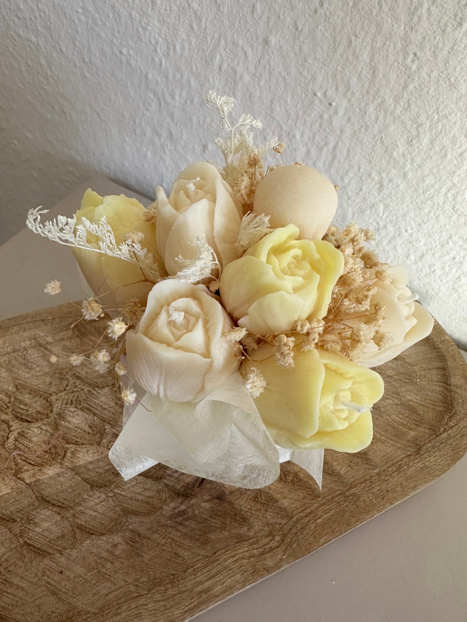 Tauche ein in die Welt von Bloom byNicole – ein Kerzenstrauß, der blumiger nicht sein könnte. Jede einzelne Blüte wurde von Hand aus Rapswachs gegossen und liebevoll zu einem harmonischen Arrangement zusammengestellt. Verpackt in einer handgegossenen form und ergänzt mit feinem Schleierkraut, ist dieser Strauß ein ganz besonderer Blickfang – ganz ohne zu welken.