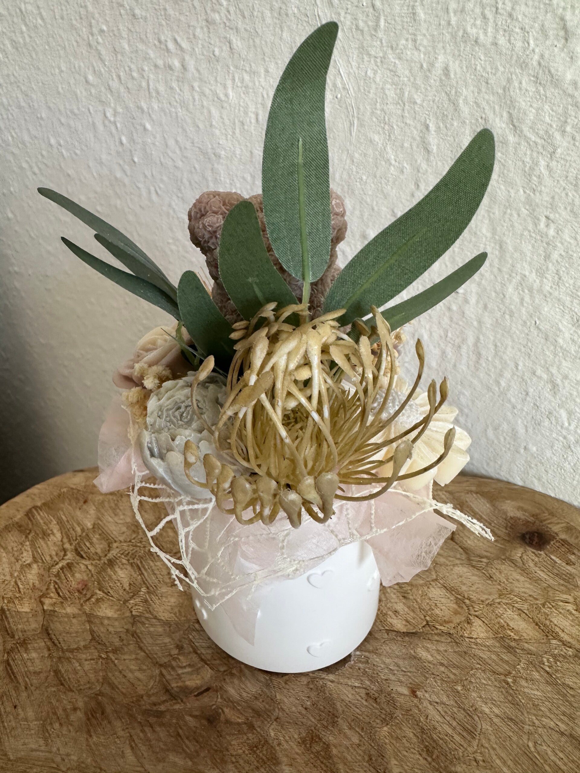 Tauche ein in die Welt von Bloom byNicole – ein Kerzenstrauß, der blumiger nicht sein könnte. Jede einzelne Blüte wurde von Hand aus Rapswachs gegossen und liebevoll zu einem harmonischen Arrangement zusammengestellt. Verpackt in einer handgegossenen form und ergänzt mit feinem Schleierkraut, ist dieser Strauß ein ganz besonderer Blickfang – ganz ohne zu welken.