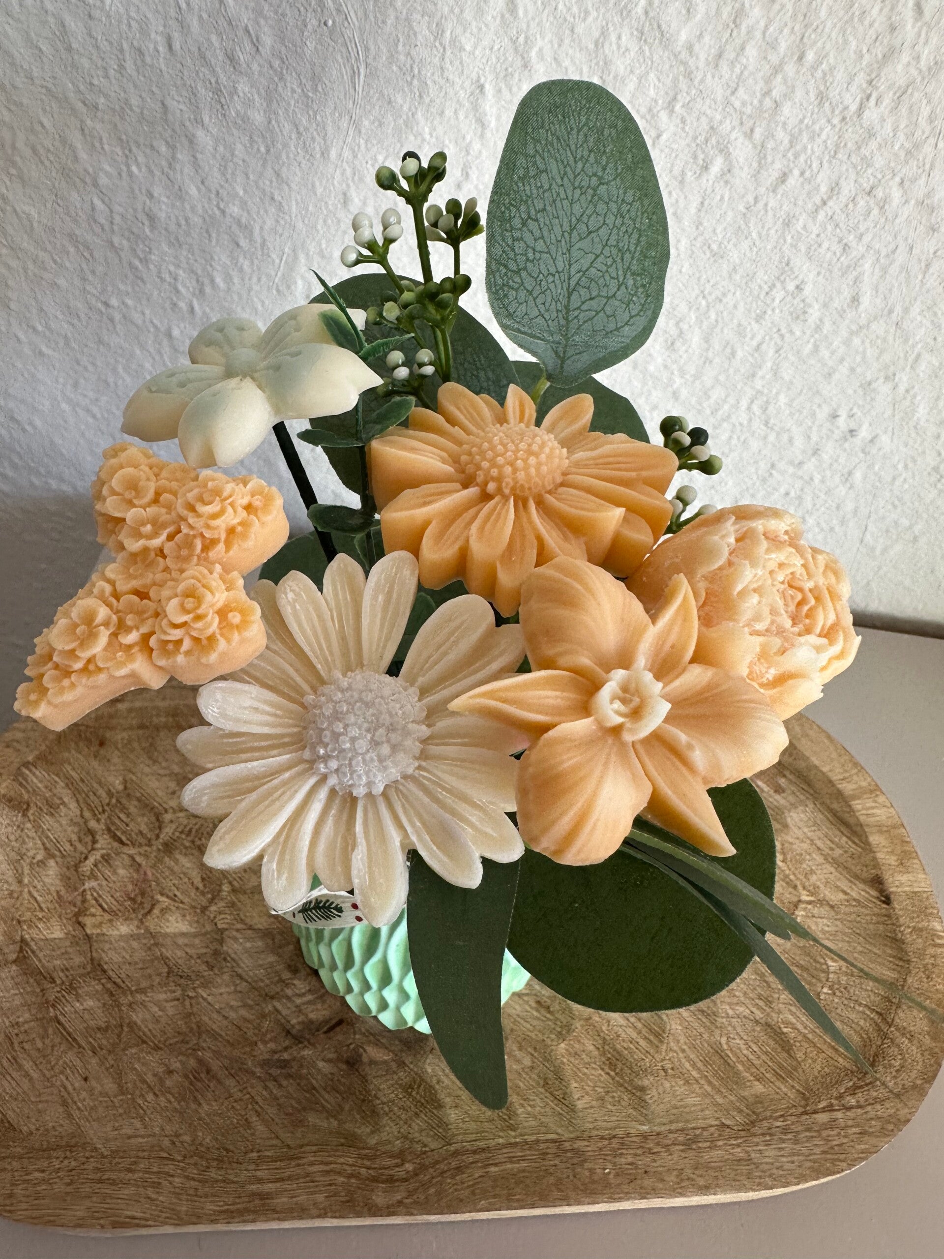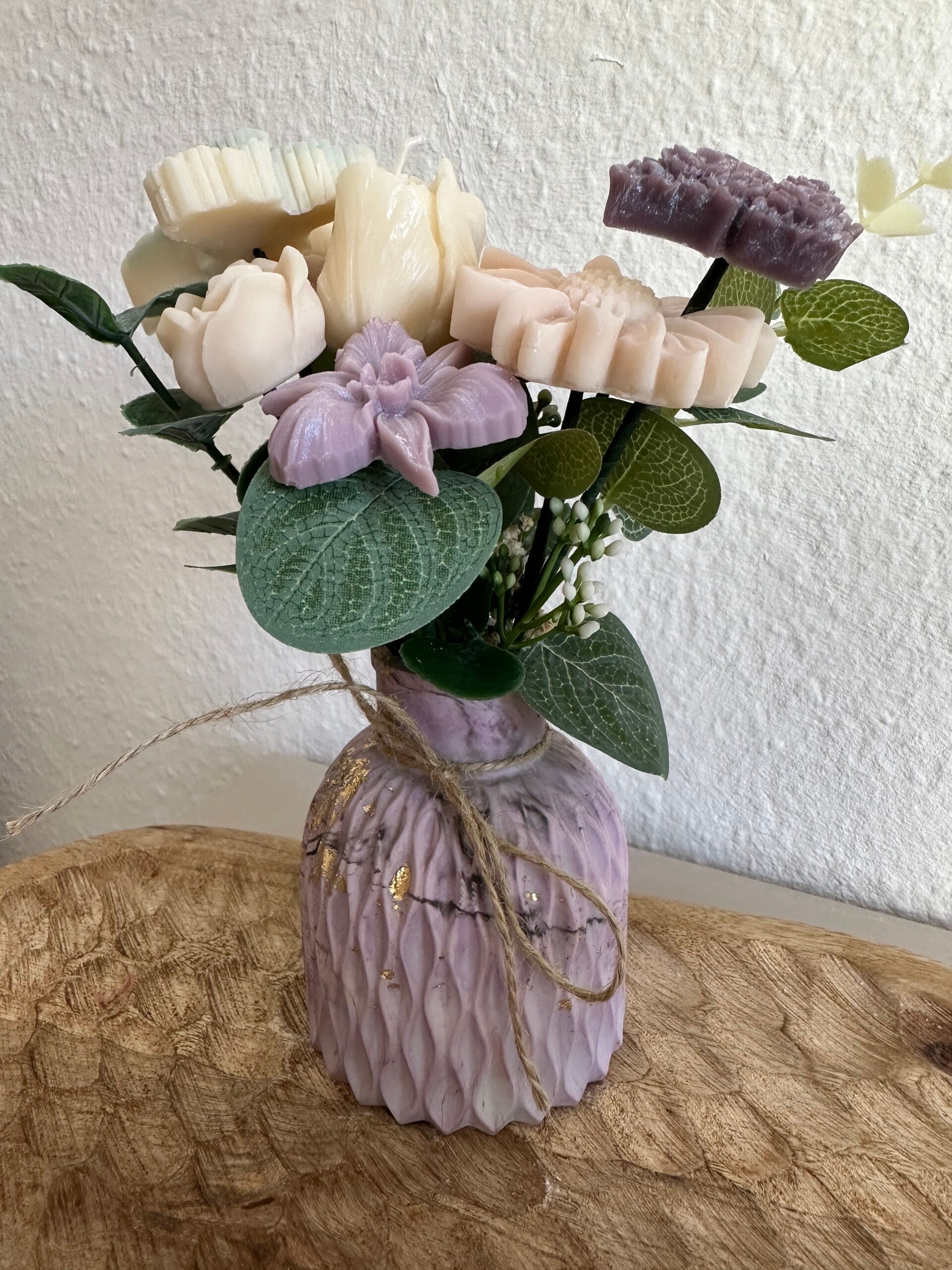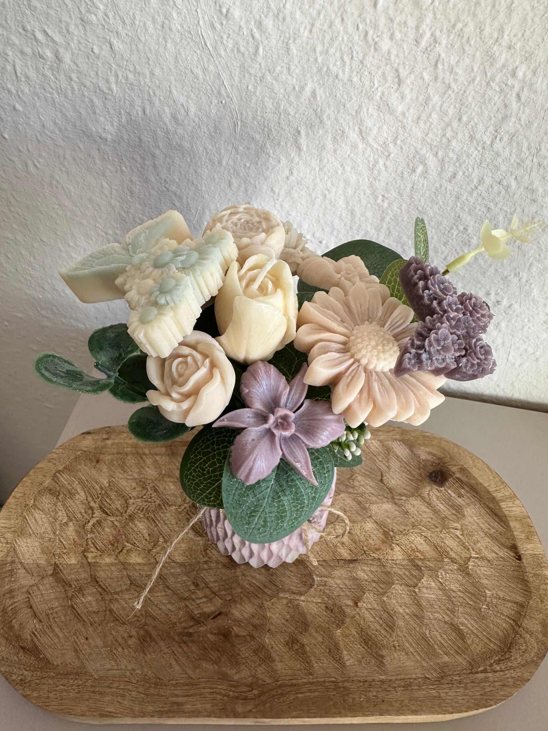 Tauche ein in die Welt von Bloom byNicole – ein Kerzenstrauß, der blumiger nicht sein könnte. Jede einzelne Blüte wurde von Hand aus Rapswachs gegossen und liebevoll zu einem harmonischen Arrangement zusammengestellt. Verpackt in einer handgegossenen form und ergänzt mit feinem Schleierkraut, ist dieser Strauß ein ganz besonderer Blickfang – ganz ohne zu welken.